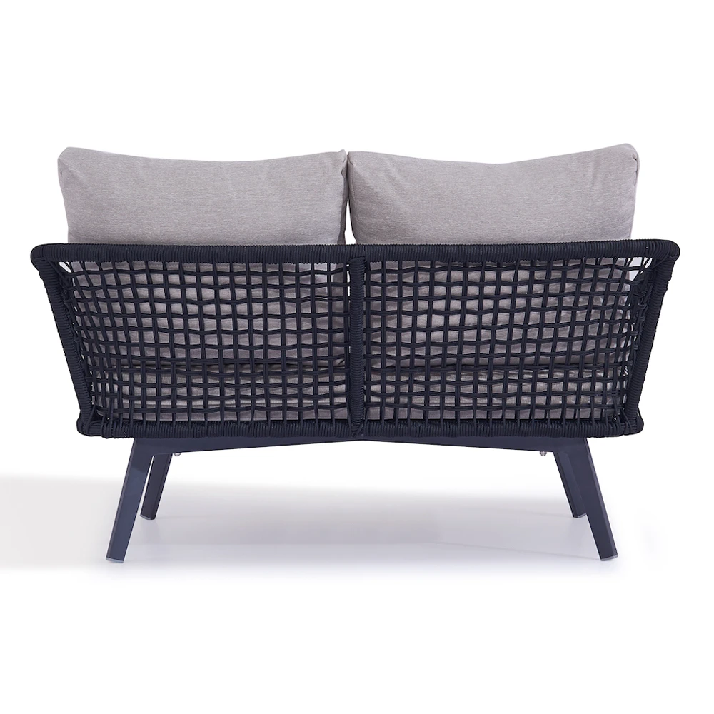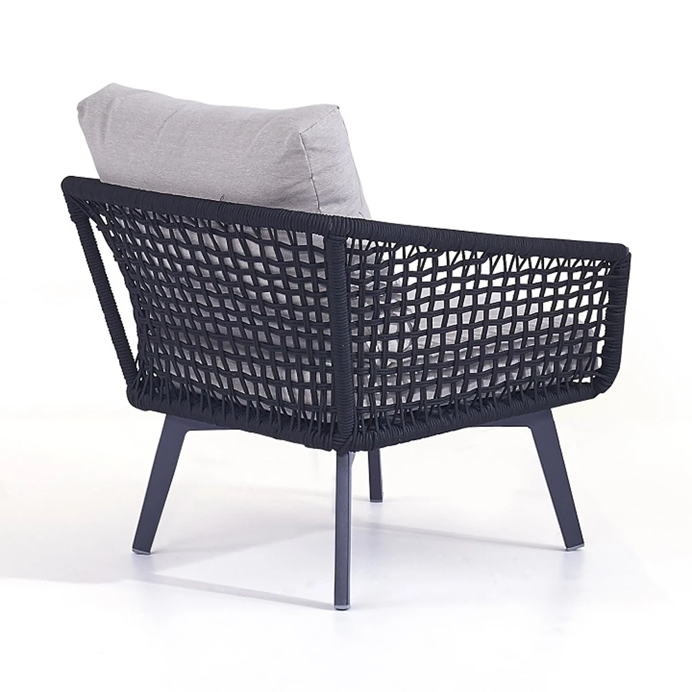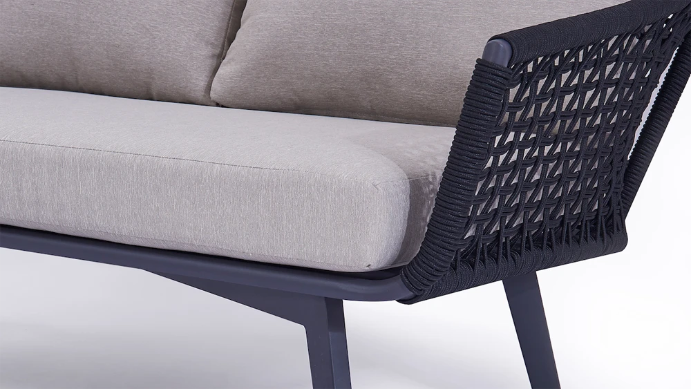 De Barcelona zitgroep uit onze nieuwe collectie is een echte eyecatcher. Rope stof is samengeweven op een aluminium frame om een ​​uniek patroon te creëren. De elementen van deze collectie zien er licht en luchtig uit, maar de banden zitten stevig vast aan het frame. De ergonomisch ronde rugleuning biedt absoluut comfort. Zit- en rugbekleding zijn voorzien van hoogwaardige Olefin hoezen, de buiteneigenschappen van alle materialen zijn optimaal voor tuinmeubelen. De mooie combinatie van zwarte stoffen banden, de matte poedercoating van het frame in antraciet en de dikke stoffering in steengrijs geven de meubels in deze set een moderne en elegante uitstraling. Met de 2 fauteuils, de tweepersoonsbank en de bijpassende salontafel kan de zomer alleen maar mooi zijn!