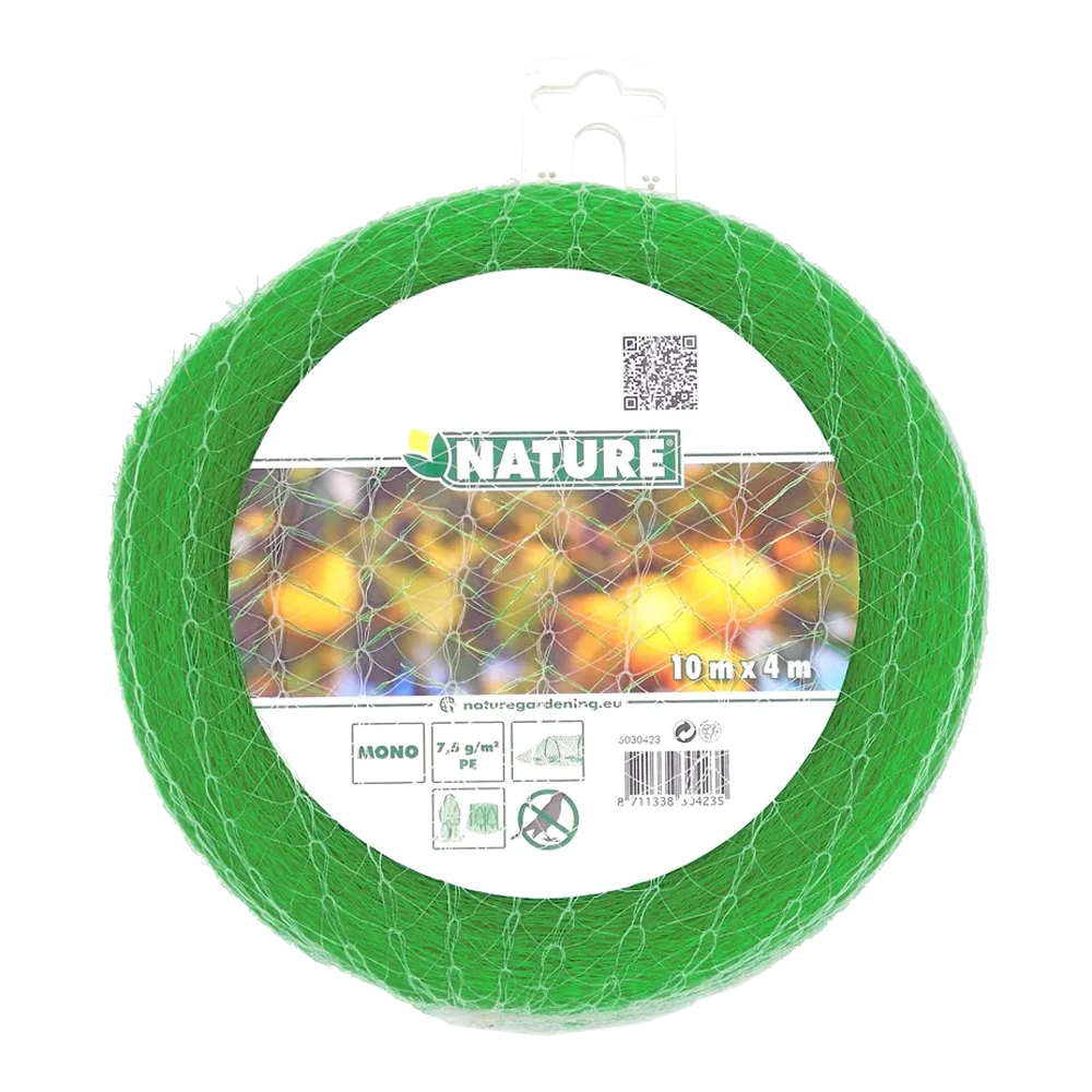 Groen uv-behandeld polyethyleennet met een dichtheid van 7,2 g/m². Het gebreide gaas is flexibel van formaat en het garen is 15 µ tot 16 µ dik. Het net kan maar één keer worden gebruikt. Dit tuinnet heeft een afmeting van 10x4m