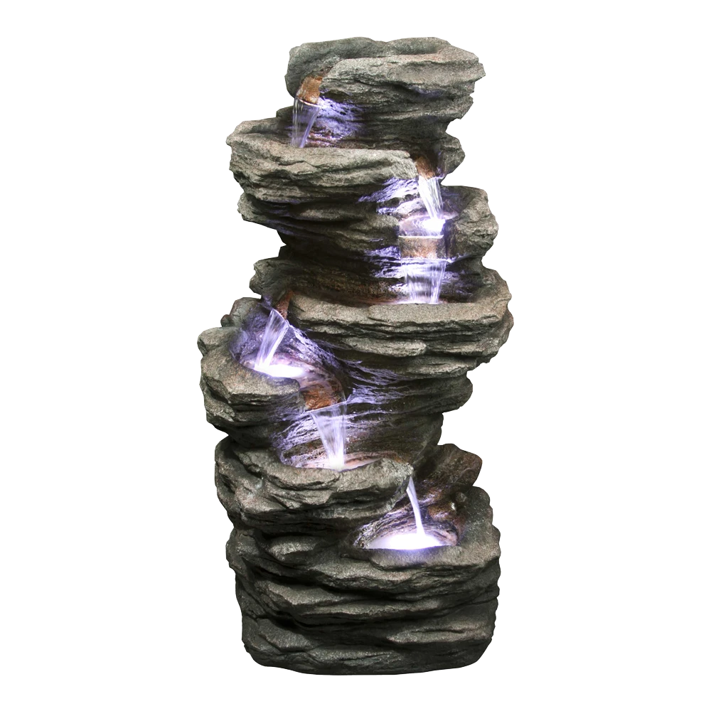 Op zoek naar een mooi waterornament voor in de tuin of op het balkon? Kies dan voor deze Waterval Kachenjunga van 81cm hoog. Dit waterornament is met zijn LED verlichting, de 6 watervallen en zijn natuurlijke design een echte eye-catcher. Hij is gemaakt van polystone, hard kunststof en is grijsbruin van kleur. Het grote voordeel van polystone is dat het precies op natuurlijke rotsen lijkt, maar licht van gewicht en weerbestendig is. Daarnaast zorgen de 6 LED lampjes voor een zeer sfeervol geheel in de avonduren.